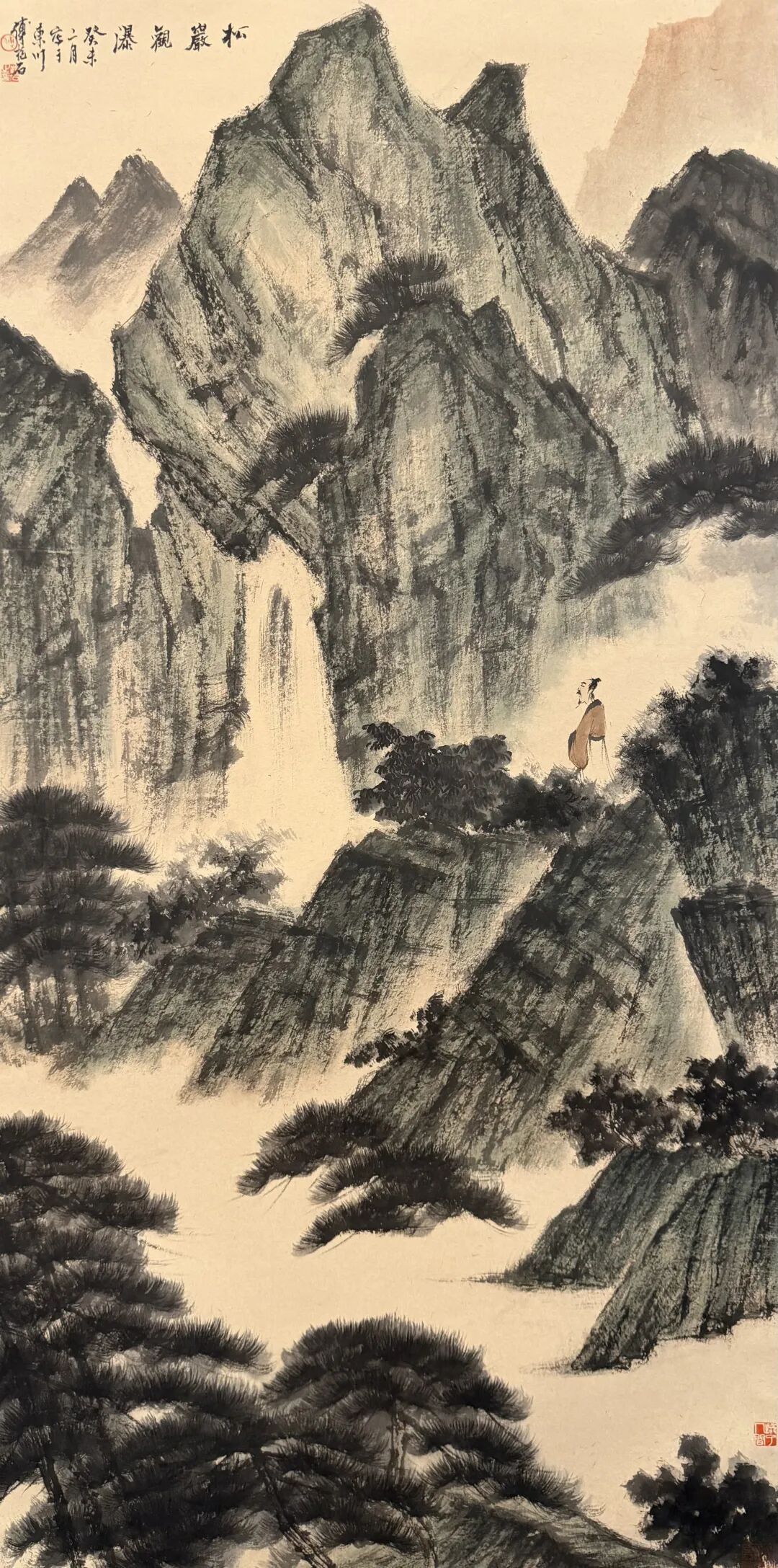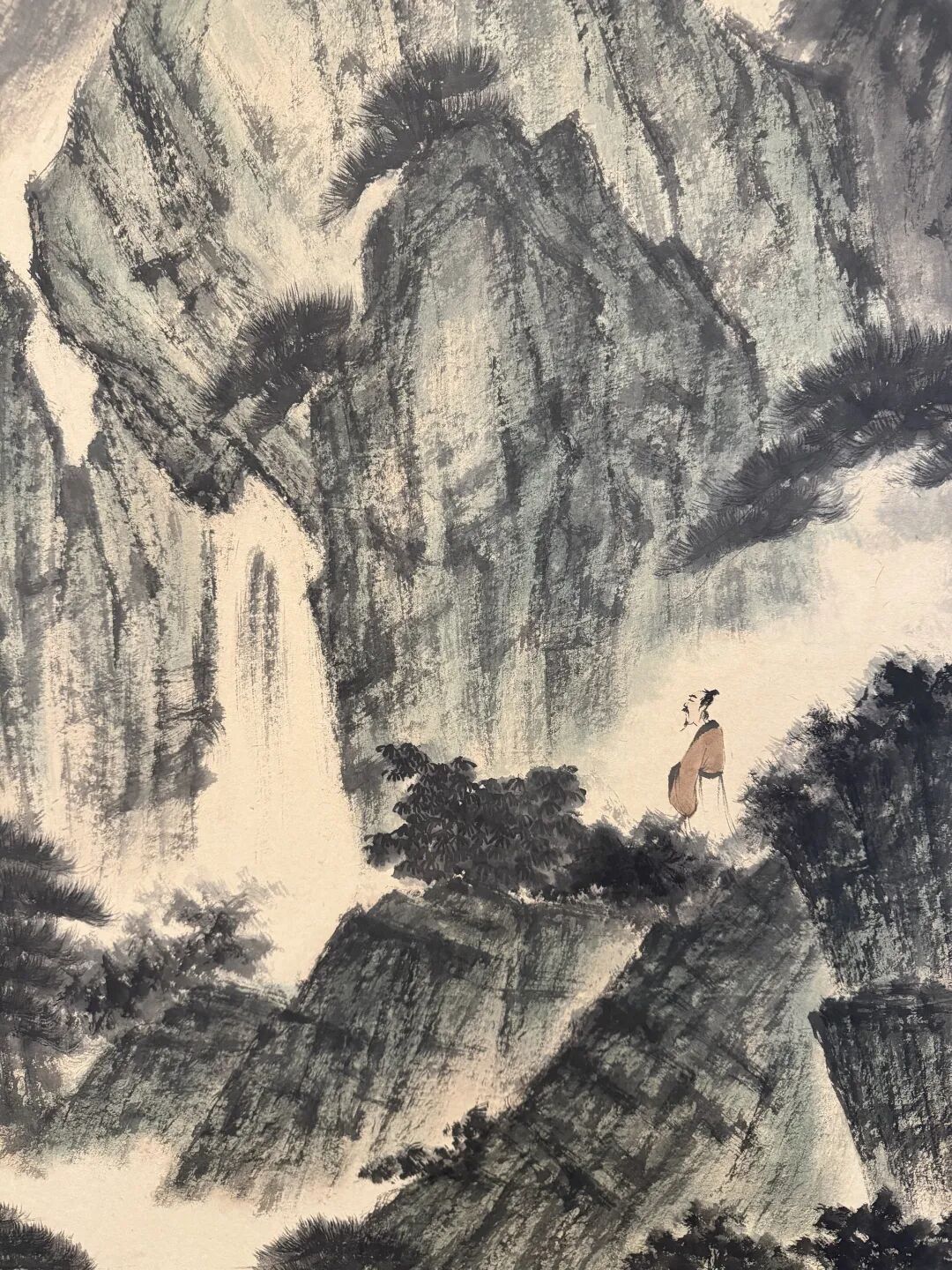 最妙的是,他让小人物站大瀑布前。人小,瀑布大,对比一出来,山川的壮阔就出来了。这不是画山水,是画人对自然的敬畏。傅抱石的《观瀑图》,是水墨里的狂想曲,看一次,爽一次。